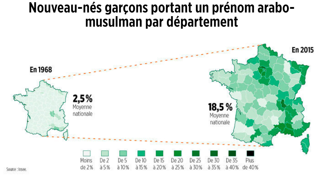 Indice : en 1997, il y avait 18,5 % de naissances musulmanes en Seine-Saint-Denis (soit le taux national d’aujourd’hui) ; en 20 ans, ce taux est passé à 51 %.