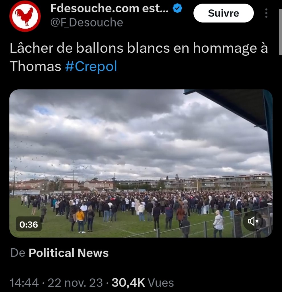 C’est le même scénario à chaque fois: organiser une « marche blanche » au lendemain d’assassinats, de meurtres, de viols etc….les plus atroces en signe de protestation aux actes les plus abjects…. avec cependant quelques consignes….Se vêtir de vêtements de couleur blanche, respecter le silence,éviter toute récupération politique… dans une France envahie, souillée par les Français pyromanes et tous les collabos qui ont vendu notre pays.Ce type de manifestation a pour but d’offrir une image rassérénée où s’agrègent toutes les émotions individuelles.Il est remarquable de constater qu’à l’heure où les cérémonies funéraires escamotent la mort et le deuil pour être remplacées peu à peu par les crémations, les « marches blanches » réussissent à regrouper des individus qui ne se retrouvent qu’à l’occasion d’actes aussi abjects.