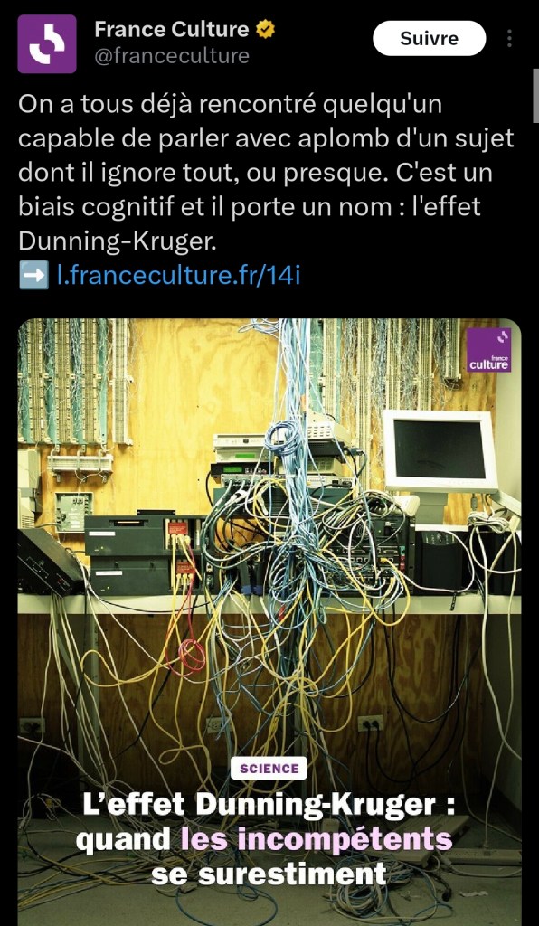 Simplicité 6 février 20246 février 2024Nicolas L C’est compliqué comme nom, Dunning-Kruger ; pourquoi ne pas simplement appeler ça l’effet journaliste ? Médiacratie Partager : Cliquer pour partager sur X(ouvre dans une nouvelle fenêtre) X Cliquez pour partager sur Facebook(ouvre dans une nouvelle fenêtre) Facebook J’aime chargement… Similaire