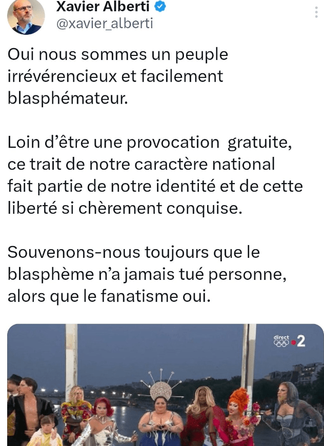 « Si des gens ont été offensés, nous nous en excusons », a déclaré la porte-parole de Paris 2024. « Si des gens ont été offensés, nous nous en excusons », c’est la phrase typique du gaslighting : je n’ai rien fait de mal, mais si dans ton esprit malade tu t’es senti blessé, je veux bien m’excuser pour te faire plaisir. Mais je n’ai rien fait de mal : c’est toi le problème. C’est toi qui dois douter de ton ressenti, pas moi qui dois me remettre en question… Je ne sais pas ce qu’il faut de plus aux gens pour comprendre que le règne des Lumières, c’est le règne des pervers.