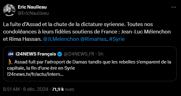 Les Lumières et l’Islam sont deux faux-jumeaux. Deux enfants du Diable. D’où leur complicité. D’où les votes systématiques des progressistes pour faire venir des islamistes ici, et leur soutien systématique aux islamistes de là-bas : Libye, Liban, Irak, Afghanistan, et maintenant Syrie. Le progressisme est un tapis rouge sang qui mène à la charia. Au bout des Lumières, il y a l’Islam.