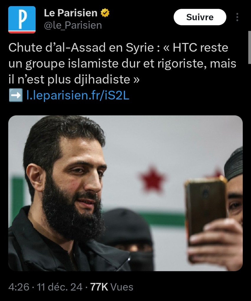 La chute du régime de Bachar Al Assad en Syrie à permis à un groupe islamique peu connu: HTC ( ex branche d’Al Qaïda) de renverser le pouvoir et de gérer la Syrie.