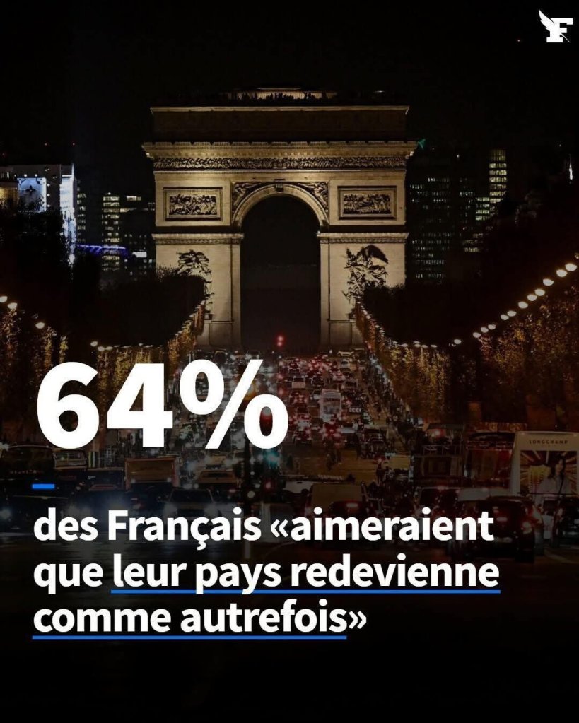 Il paraît que 64% des Français aimeraient que leur pays redevienne comme autrefois. Si cette statistique est vraie, elle est inquiétante : 64% des Français voudraient donc que leur pays redevienne comme il était avant leurs votes. Il paraît que la France est le pays de la raison…